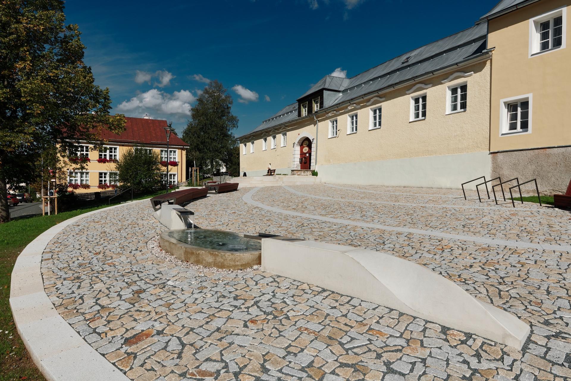 S odkazem na nespoutanou přírodu kolem Železné Rudy jsou všechny tvary náměstí, pěších cest a okrasných záhonů navrženy v jemných křivkách a použité materiály jsou přírodního charakteru. Hlavní zpevněná plocha náměstí byla zvolena v horní části území pod zámkem, v klidové zóně, kde je odstup od frekventované silnice a navíc se nabízí výhledy do okolí a směrem na kostel Panny Marie Pomocné. Budova zámku vytváří navrženému náměstí pozadí a hlavní vstup do zámku s provozovanou kavárnou přímo na náměstí navazuje. Částečně vyrovnaná plocha nabízí možnost konání kulturních akcí. Zpevněná plocha je z přírodní kamenné dlažby použité v různých formátech, v největší míře to jsou žulové odseky. V rámci plochy jsou osazeny dřevěné lavičky a v jižní části je navržen vodní prvek. Ten tvoří dva betonové kvádry s kovovými chrliči, které navazují na vloženou křivku v rámci zádlažby. Voda z chrličů se vlévá do společné betonové kašny a symbolizuje jako dvě říčky českou a německou stranu, které od nepaměti musely v drsných podmínkách Šumavy spolupracovat. To je i odkazem spisovatele Karla Klostermanna, jenž vždy vnímal Šumavu jako společný domov obou národů.